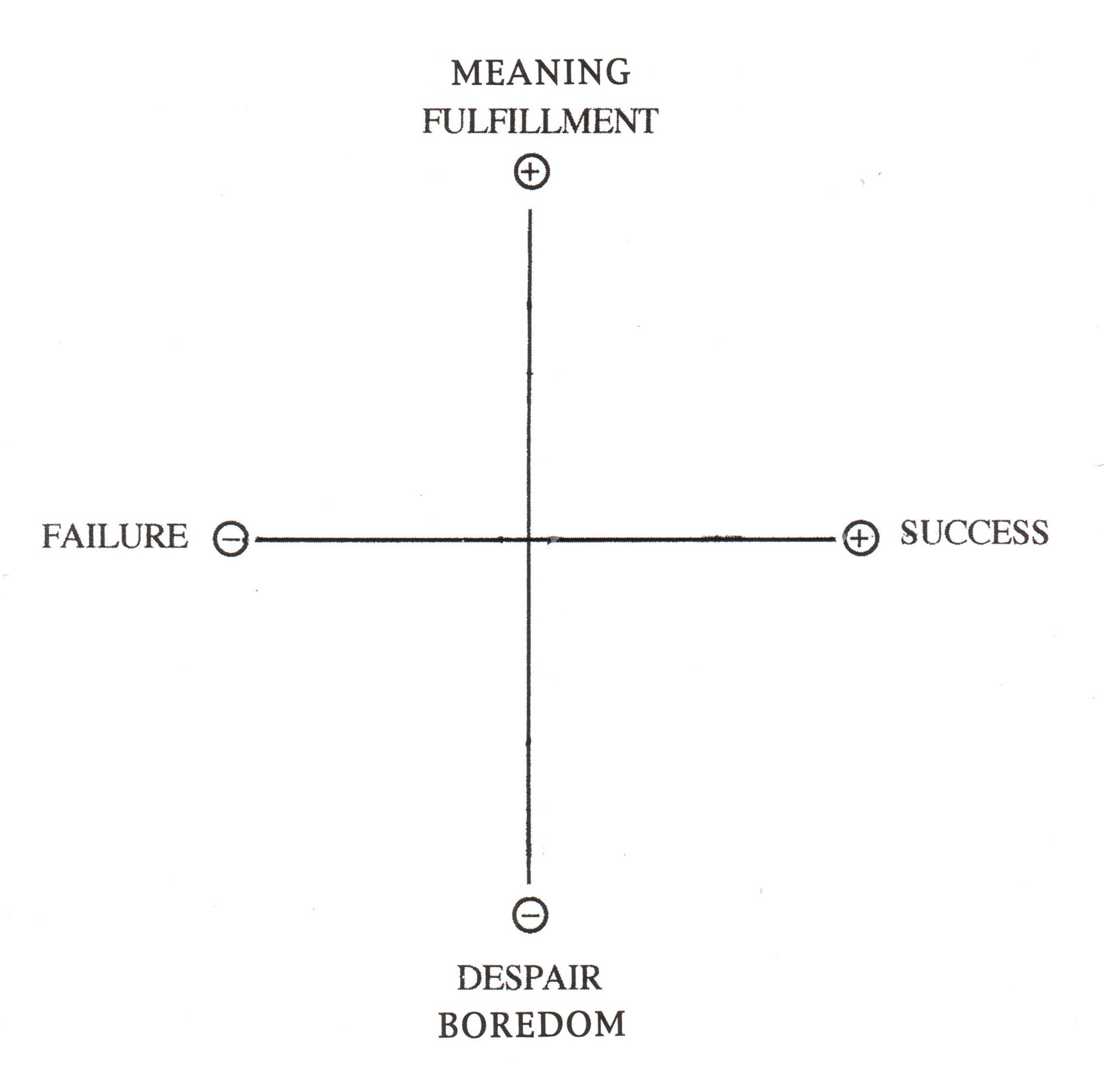 The horizontal axis that I already mentioned is the easiest one: That is where aspirations of most people are: To build a career, to become affluent. A loser, in most people’s minds, is someone far on the FAILURE side. But there is another direction a person is able to and does walk: that between DESPAIR/BOREDOM and MEANING/FULFILLMENT.